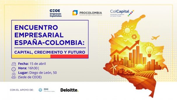 La Confederación Española de Organizaciones Empresariales (CEOE), en colaboración con ProColombia y ColCapital –Asociación Colombiana de Capital Privado–, tiene el gusto de invitarle al Encuentro Empresarial España–Colombia: Capital, Crecimiento y Futuro que se celebrará en la sede de la CEOE en Diego de León, 50 en Madrid el próximo 15 de abril a las 16h30.