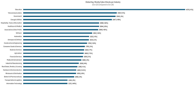 Media mundial de ciberataques semanales por sector (octubre 2025 comparado con octubre 2024)