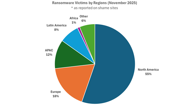 La actividad de ransomware volvió a repuntar en noviembre, con 727 ataques denunciados públicamente en todo el mundo, lo que supone un aumento interanual del 22% respecto al mismo periodo de 2024. Norteamérica concentró la mayor parte de los incidentes, con el 55% de los casos registrados, seguida de Europa, que representó el 18%. Estados Unidos se mantuvo como el principal objetivo global, acumulando el 52% de las víctimas documentadas. A continuación, se situaron Reino Unido (4%) y Canadá (3%), lo que confirma la presión sostenida que este tipo de ciberataques ejerce sobre infraestructuras críticas y sectores altamente digitalizados.