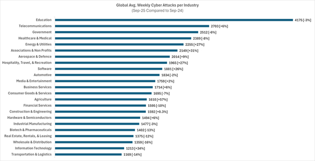 Media mundial de ciberataques semanales por sector (septiembre 2025 comparado con septiembre 2024)