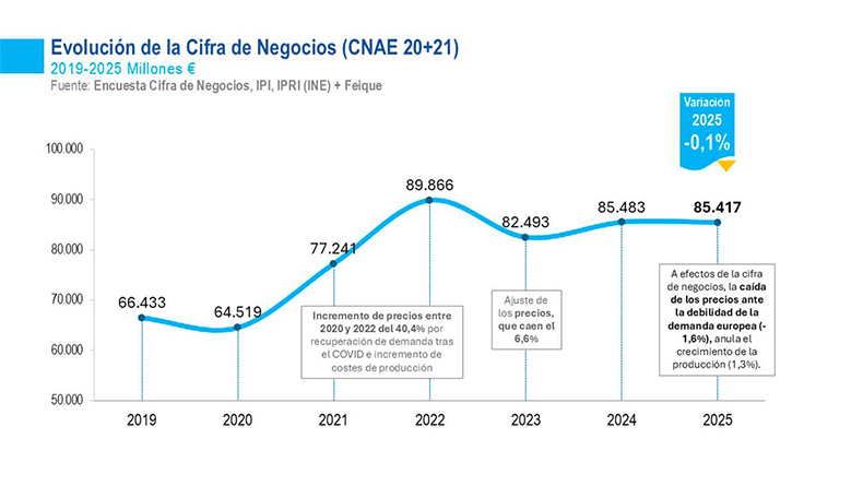 El sector químico español (CNAEs 20 y 21) cerró 2025 con una cifra de negocios de 85.417 millones €, prácticamente similar a la registrada en 2024 (-0,1%). Aunque la producción creció un 1,3%, la caída de los precios (-1,6%) anuló este crecimiento ajustando a la baja la cifra de negocios. La debilidad de la demanda europea, junto a la creciente presión competitiva internacional y las tensiones comerciales han condicionado el comportamiento negativo de los precios.