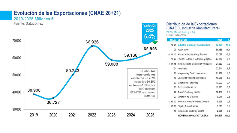 En 2025, las exportaciones del sector químico alcanzaron los 62.926 millones €, registrando un crecimiento del 6,4%, lo que le situó como primer sector exportador de la industria española, al concentrar el 18% de las mercancías vendidas en mercados exteriores, seguido de la automoción (16,1%) y la industria alimentaria (15,2%).
