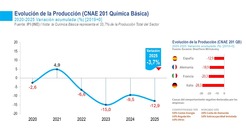 En el caso de España, la expectativa de unos precios energéticos más competitivos, apoyada en una amplia base de generación renovable y en el positivo comportamiento de la economía, han permitido amortiguar parcialmente este deterioro respecto a otros países comunitarios. No obstante, la tendencia seguirá siendo descendente si no se adoptan medidas de choque adecuadas. Es relevante subrayar, además, que la Química Básica suministra productos esenciales para el 98% de las actividades productivas al estar al inicio de prácticamente todas las cadenas de valor, constituyendo un elemento fundamental para la autonomía estratégica.