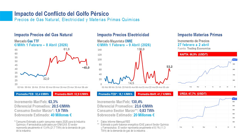 Por lo que respecta al actual conflicto en el Golfo Pérsico, su principal impacto sobre el sector químico se concentra en el incremento de los costes energéticos, especialmente del gas natural y la electricidad. En el primer caso, el diferencial de precios registrado en marzo respecto a febrero alcanza los 20,5 €/MWh, lo que supone un sobrecoste estimado de 40 millones € para el sector.