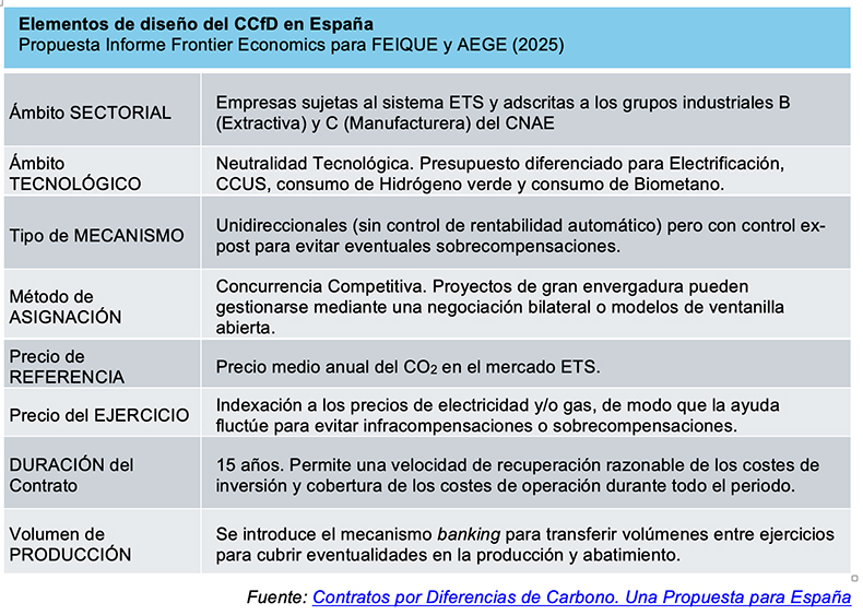 En 2025, la consultora Frontier Economics elaboró para FEIQUE y AEGE una propuesta de funcionamiento de los Contratos por Diferencias de Carbono para España, basada en los modelos ya vigentes en Alemania, Países Bajos, Francia y Dinamarca, que recoge sustancialmente los elementos de diseño del mecanismo.