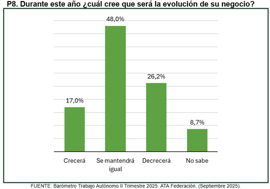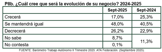 Las perspectivas de los autónomos de cara a los últimos meses del año también han empeorado ligeramente con respecto a los datos de hace un año(P8b). Únicamente el 17% de los autónomos encuestados cree que su negocio crecerá en los tres últimos meses de 2025, porcentaje  inferior al 15,2% registrado en junio de 2025 y al 25,3% registrado en el mismo periodo de 2024.