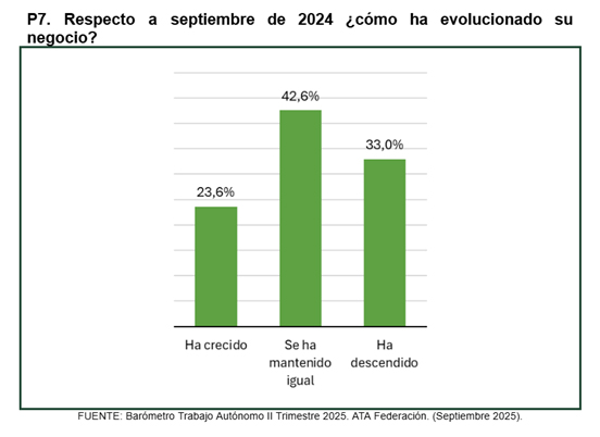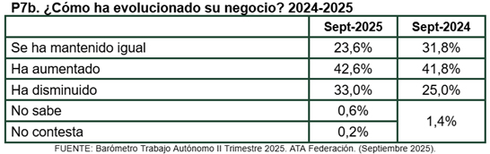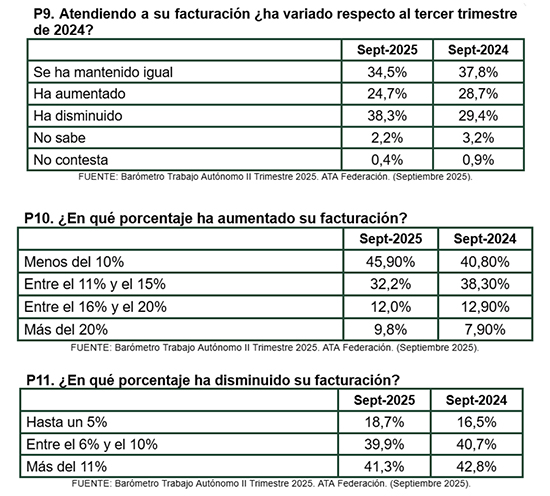 En cuanto al 38,3% de autónomos que han visto cómo su facturación ha disminuido con respecto al mismo periodo de 2024, el 41,3% cifra la caída en más del 11%. (P11).