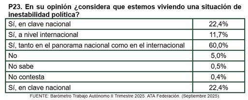 Así, y a pesar de que los datos macroeconómicos que estamos registrando no son malos, el 94,1% de los autónomos encuestados por ATA consideran que estamos atravesando una situación de inestabilidad política, ya sea a nivel nacional, internacional o ambas y nueve de cada diez, el 90% cree que esa situación afecta a su negocio o a la economía en general. Esta percepción es muy superior a la registrada en el anterior barómetro, de junio de 2025, donde el porcentaje de autónomos que consideraba negativa la situación de la economía española era del 73%.
