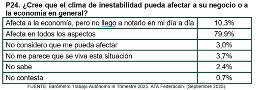 Otra de las cuestiones importantes que hemos preguntado a los autónomos es si considera que el clima de inestabilidad puede afectar a su negocio o a la economía en general (P24). La respuesta es nuevamente contundente: nueve de cada diez autónomos, el 79,9% considera que la situación de inestabilidad afecta negativamente a su negocio.