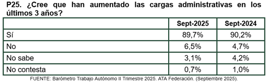 Así, uno de los aspectos que se analizan en los Barómetros de ATA es si los autónomos consideran que han aumentado las cargas administrativas en los últimos tres años. La respuesta es clara: nueve de cada diez autónomos, el 89,7%, afirma que sí, frente a únicamente el 6,5% que considera que no han aumentado las cargas administrativas. (Ver tabla P25).