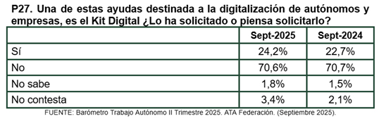 En cuanto a la ayuda concreta para el programa Kit Digital, el 24,2% de los autónomos afirma haberla solicitado o tiene pensado hacerlo a corto-medio plazo. (P27).