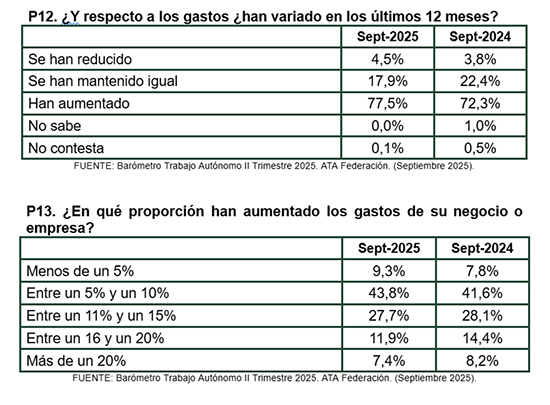 Si comparamos los datos registrados en este barómetro con los del barómetro de septiembre de 2024 volvemos a comprobar que los gastos mantienen la tendencia al alza: en el barómetro de septiembre de 2024 era el 72,3% el porcentaje de autónomos que afirmaba que sus gastos habían aumentado, en este el porcentaje ha ascendido hasta el 77,5%, más de cinco puntos porcentuales en un año.