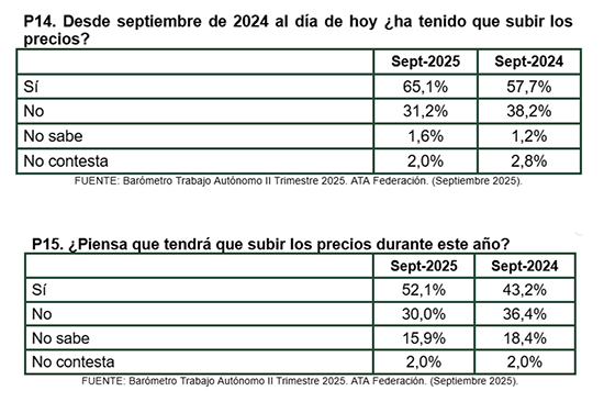 Una vez más, hemos querido conocer si los autónomos, como consecuencia del aumento generalizado de los precios y de los gastos que vienen soportado, se han visto obligados a subir los precios de sus productos o servicios a lo largo de este 2025 (P14).