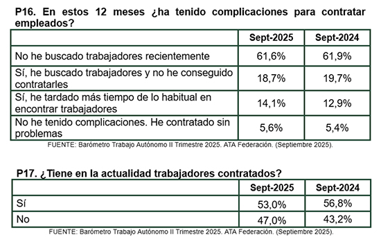 En cuanto a temas relacionados con la contratación y trabajadores de los autónomos, en el Barómetro de ATA hemos querido conocer cómo está la situación a la hora de contratar nuevos trabajadores, si están teniendo dificultades y cuáles son sus perspectivas de cara a los próximos meses. Incluso si se plantean despedir.
