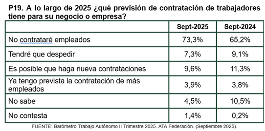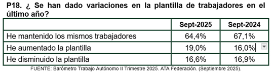 Finalmente, el 19% de los autónomos afirma haber aumentado la plantilla a lo largo de 2025.