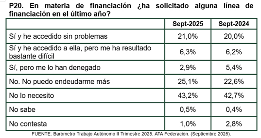 Del 68,3% de los autónomos que afirman no haber solicitado la financiación, el 43,2% afirma no necesitarla. Pero hay un 25,1% de los autónomos encuestados que afirma que no ha solicitado financiación porque está en una situación en la que no puede endeudarse más.