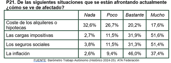 La situación para muchos autónomos no es fácil. El hacer frente a las cargas impositivas afecta significativamente al 83,5% de los autónomos encuestados (P.21), seguido muy de cerca por las consecuencias de la subida generalizada de los precios (inflación), que afecta en el día a día al 83,4% de los autónomos encuestados.
