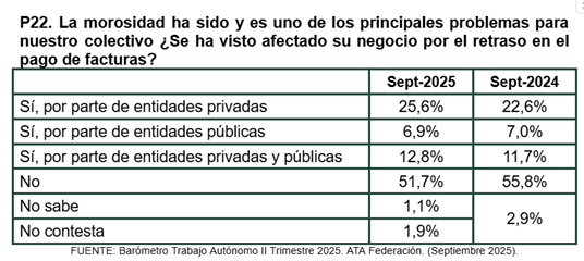 La morosidad tanto pública como privada ha sido y sigue siendo uno de los principales problemas para nuestro colectivo y afecta al 45,3% de los autónomos. Así, se comprueba cómo este porcentaje sube ligeramente en relación a septiembre de 2024, cuando el porcentaje de morosidad entre el colectivo era del 41,3%. (Ver tabla P22).