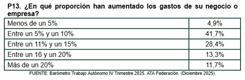 En el capítulo de los gastos que afectan a las actividades de los autónomos, vemos que ocho de cada diez autónomos, el 81,8%, afirman que los gastos han aumentado en 2025, porcentaje que supera al 78% registrado en el barómetro que abría 2025 (P.12). Y de ese 81,8% de autónomos que afirma que sus gastos han aumentado en 2025, uno de cada cuatro, el 25% cifra este aumento por encima del 16%.