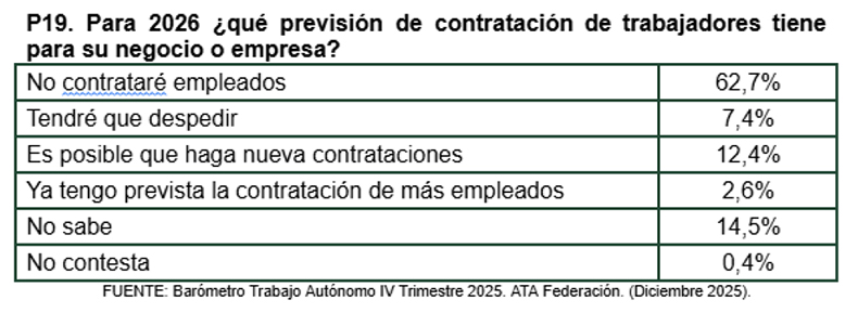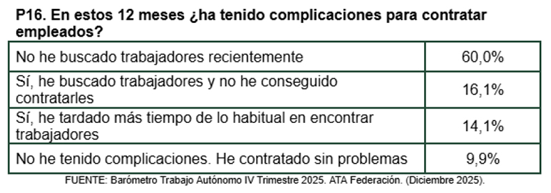 Una vez más, en el barómetro de ATA hemos querido conocer cómo está la situación a la hora de contratar nuevos trabajadores, si están teniendo dificultades y cuáles son sus perspectivas de cara a 2026.