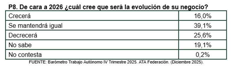 Las perspectivas de los autónomos de cara al año que acaba de comenzar han empeorado con respecto a enero de 2025. Únicamente el 16% de los autónomos cree que su negoció crecerá a lo largo de 2026, porcentaje ligeramente inferior al 19% registrado en enero de 2025. El 39,1% espera que su actividad se mantenga estable frente a uno de cada cuatro autónomos, el 25,6%, que no es tan optimista y considera que su situación empeorará de cara a los próximos meses.