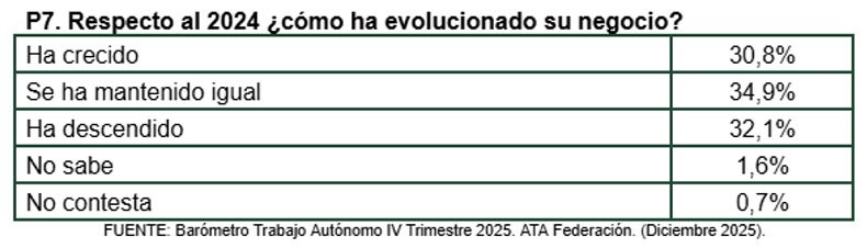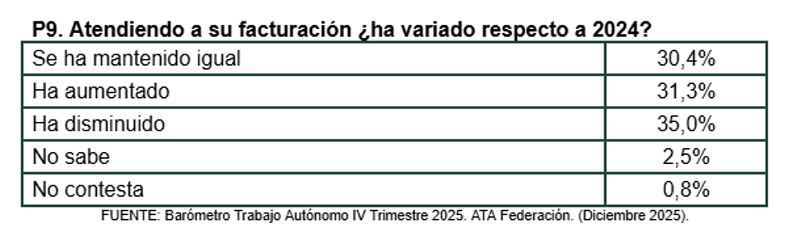El 30,4% de los autónomos responde que su facturación se ha mantenido similar a la registrada en 2024 y el 35% considera que su facturación en 2025 y con relación a 2024 ha disminuido. Así, para dos de cada tres autónomos, el 65,4%, 2025 ha sido un año en el que su facturación ha sido inferior o similar al ejercicio anterior.