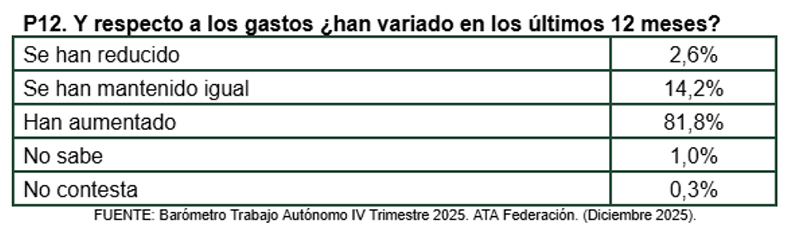 El 14,2% de los autónomos afirma que sus gastos han sido similares a los registrados el pasado ejercicio. Únicamente el 2,6% de los autónomos encuestados en el Barómetro de ATA afirman haber experimentado una reducción de sus gastos en el último año.