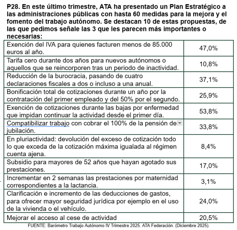 Por ello, en este primer barómetro que cierra 2025 y abre 2026 hemos preguntado a los autónomos cuáles son sus principales demandas y la respuesta ha sido clara: los autónomos piden, entre otras cosas, no pagar la cuota de autónomos mientras están de baja por enfermedad, la exención del IVA para quienes facturen menos de 85.000 euros al año y reducir a dos las declaraciones fiscales.