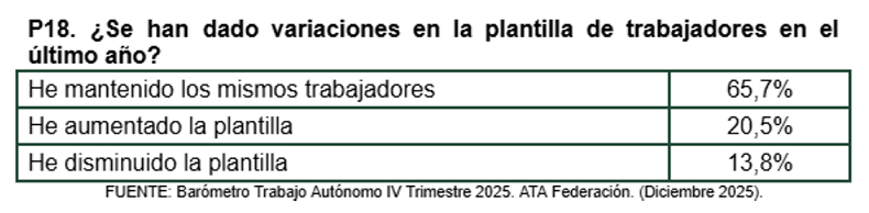 El 13,8% de los autónomos que han contestado al Barómetro de ATA y que tienen trabajadores en plantilla dicen haber tenido que disminuirla en 2025.