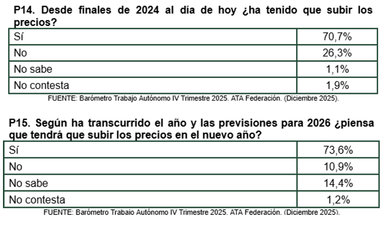 En cuanto a lo que piensa hacer de cara a este 2026 (P15), la respuesta es contundente: el 73,6% afirma que si todo sigue como hasta ahora se van a ver obligados a subirlos de cara a los próximos meses. El 10,9% de los autónomos espera no tener que hacerlo.