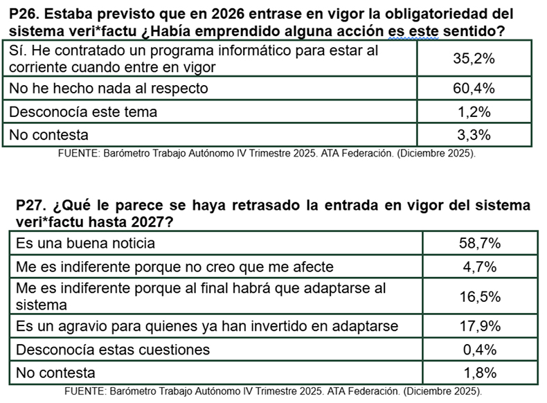 Finalmente, en este Barómetro que cierra 2025 y abre las perspectivas del colectivo de cara a 2026 hemos querido conocer dos aspectos muy importantes y que están de actualidad: el retraso de la entrada en vigor del sistema verifactu y las propuestas más importantes que se tendrían que llevar a cabo para mejorar el día a día de los más de 3,4 millones de autónomos.