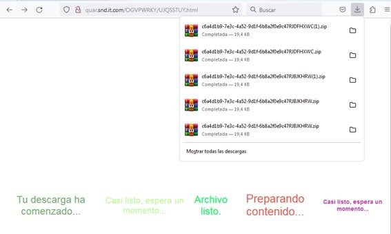 Una vez superado este trámite somos redirigidos a una web usada para alojar los ficheros que componen la primera fase de la cadena de infección. Observamos como se muestra que la descarga ha empezado y que el archivo está listo mientras este se descarga en el sistema del usuario. Cabe destacar el hecho de que esta web está pobremente diseñada y esto puede hacer sospechar a más de un usuario, pero los delincuentes confían en que, aun así, seguirán obteniendo las suficientes víctimas como para que la campaña les salga rentable.