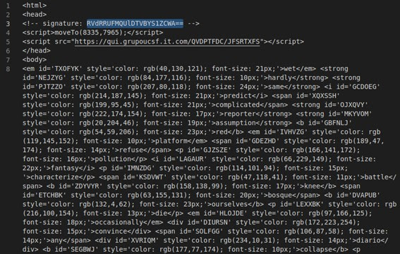 Dentro del fichero HTA, encontramos unas pocas líneas de código útil, ya que casi todo el archivo es relleno para ocultar una única acción real, que es cargar JavaScript remoto desde un dominio externo. También encontramos una firma codificada en, que parece un identificador o marcador interno más que contenido funcional del HTML.