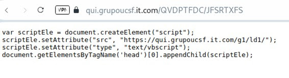 Lo especialmente relevante de este fichero es la URL desde la cual se carga un script preparado por los delincuentes, URL que se encuentra perfectamente visible en texto plano y que nos redirige a la siguiente web.