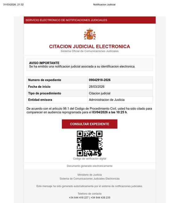 Los correos electrónicos, que simulan ser comunicaciones oficiales, instan al destinatario a abrir un documento PDF adjunto. Este archivo muestra una falsa citación judicial con elementos visuales como el escudo de España, reforzando la credibilidad del mensaje. Además, incluye tanto un enlace como un código QR que redirigen a una web controlada por los atacantes.